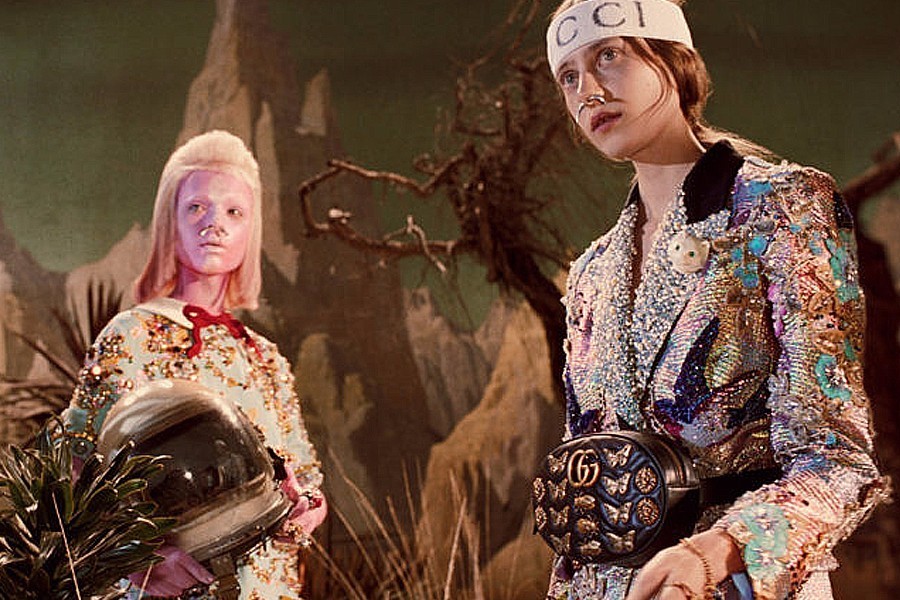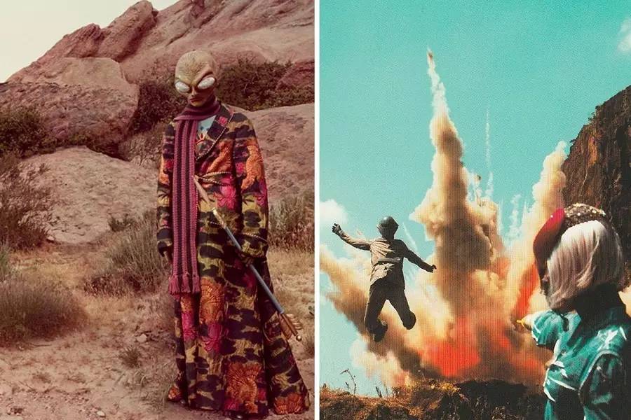 这次的宣传影片 Alessandro Michele彻底改变 Gucci 给人的美式复古印象,从 2017 春夏的罗马直接穿越到 50-60 年代科幻片风格的复古未来世界。