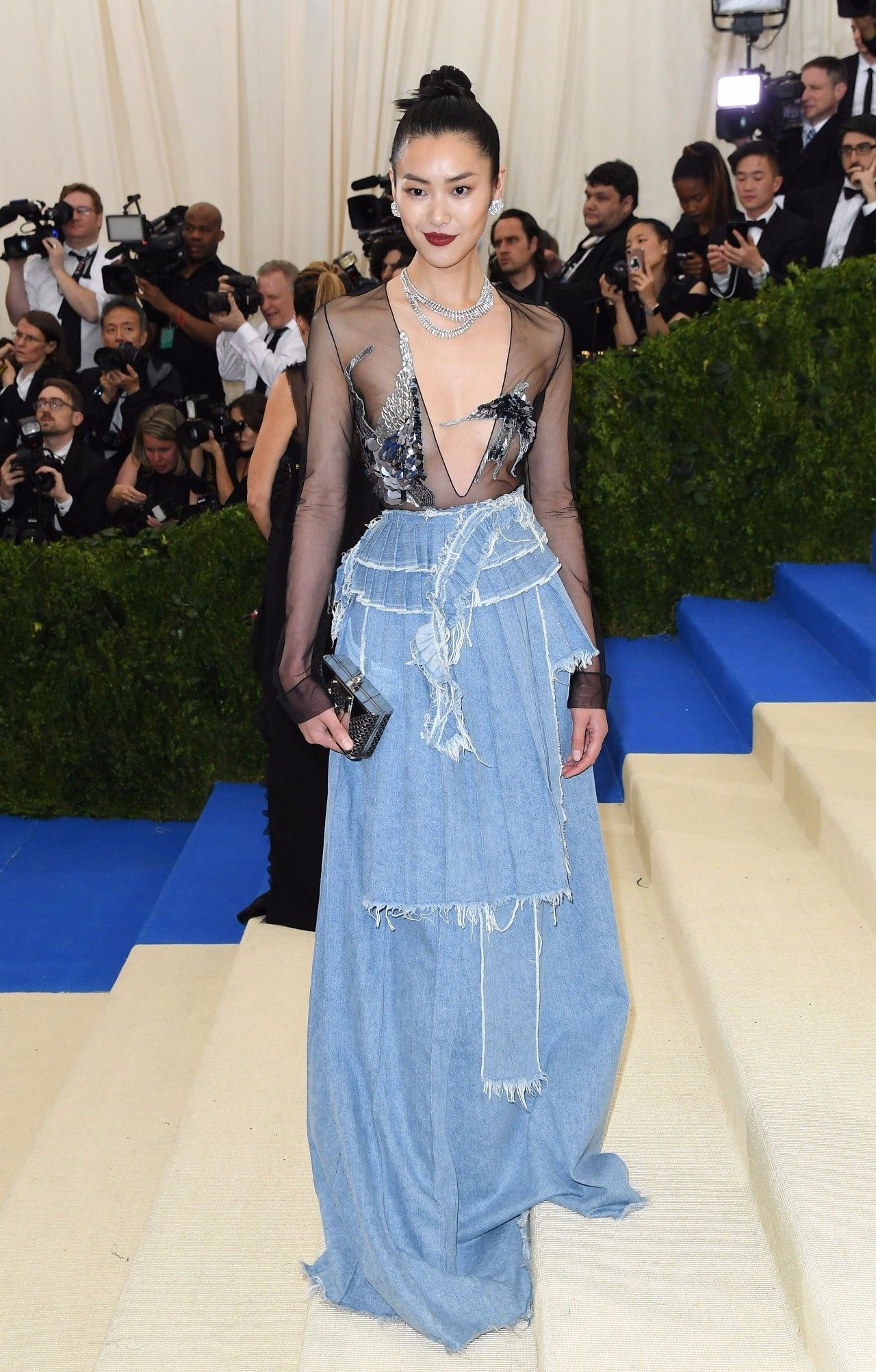 就是这件 2017 Met Gala 纽约大都会时装庆典上,“大表姐” 刘雯被评为 “全场最佳着装” 的一身亮片刺绣深 V 透视牛仔布拼接礼服。不要怀疑,这出自 OFF-WHITE。