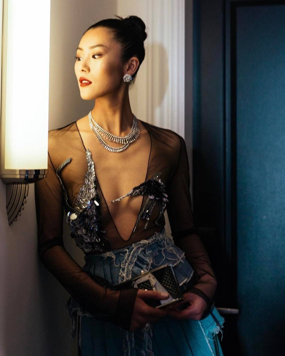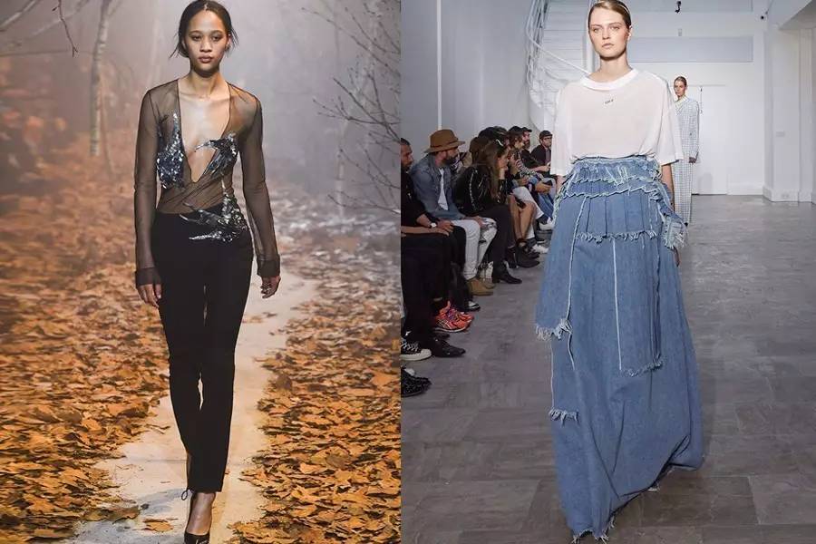 其中透视上衣来自品牌 2017秋冬秀场,撕边牛仔裙来自 2016春夏秀场。