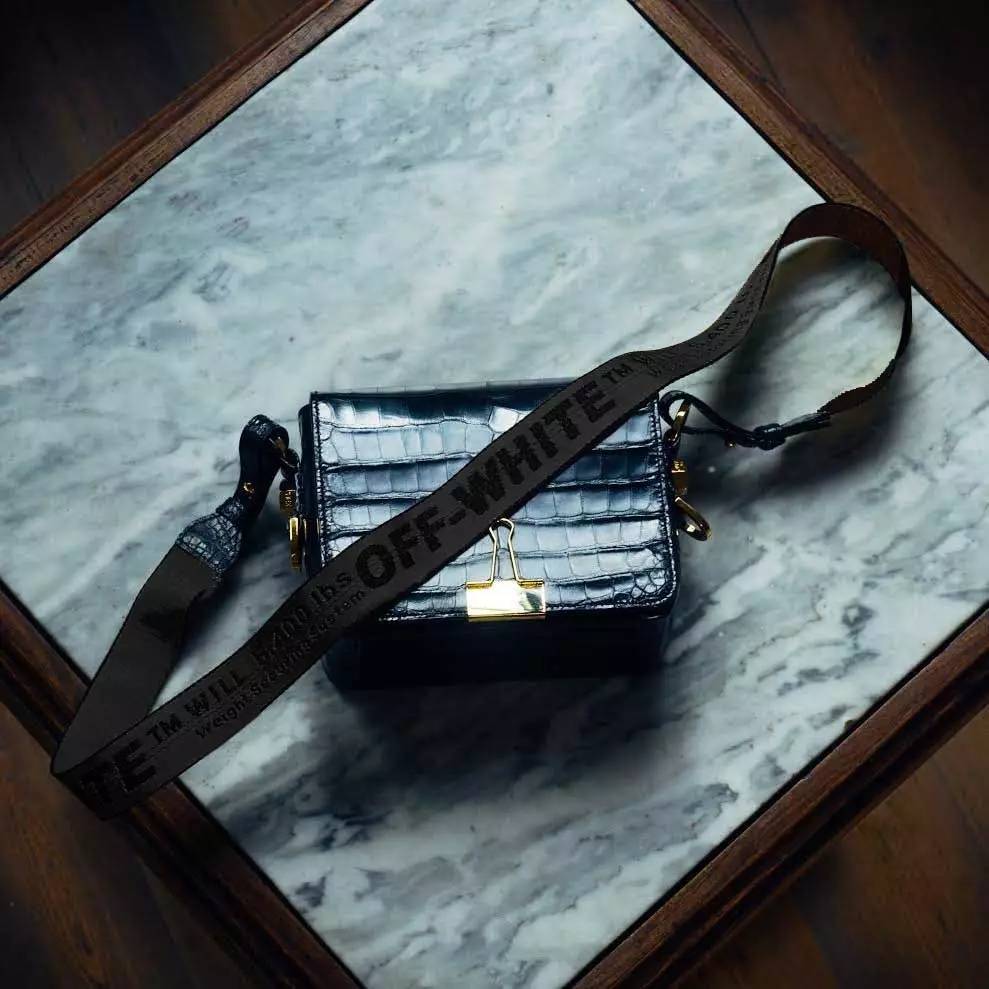 这款包包采用黑色鳄鱼皮材质做包身,黄金色装订夹紧固包身,虽然没有 Chanel 抑或是 YSL 的链子皮带,但配备的同色调工业风背带,更能凸显它的街头气质和奢侈质感。