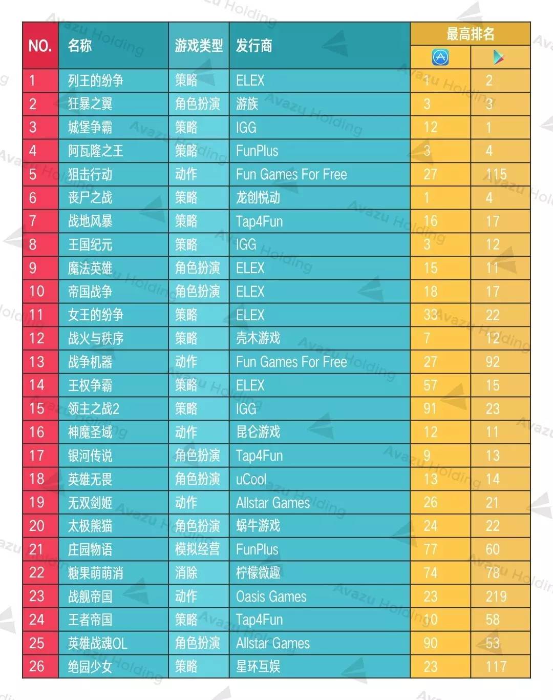 在截止6月30日的过去3个月中,《列王的纷争》《狂暴之翼》《阿瓦隆之王》和《丧尸之战》问鼎过日畅销榜双榜TOP10,其中《列王的纷争》和《狂暴之翼》在俄罗斯市场表现最为抢眼。