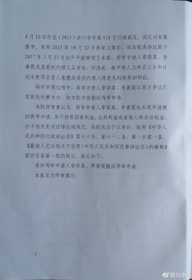 历经两年的再审审理,浙江单独“抢生”二孩的两对当事人夫妻,在收到计生部门不予以处罚的承诺后,接受浙江高院的调解,于近日收到浙江高院准予当事人撤回再审申请的终审裁定。