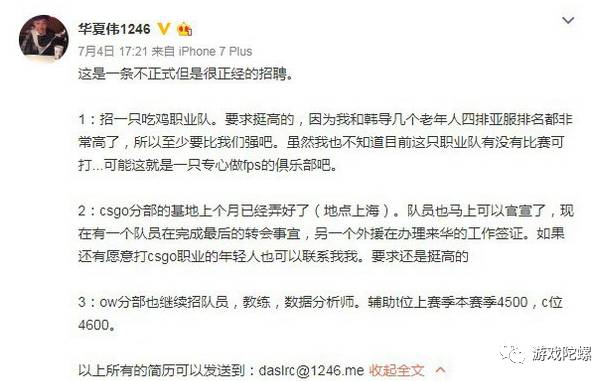 但韩寒似乎并不只是玩玩而已,似乎是想要来点真的,就在前段时间,韩寒一手组建的1246俱乐部,旗下经理发布了一条不正式但是很正经的招聘微博:正在招收吃鸡职业队员!要求至少也要“比韩寒强”。