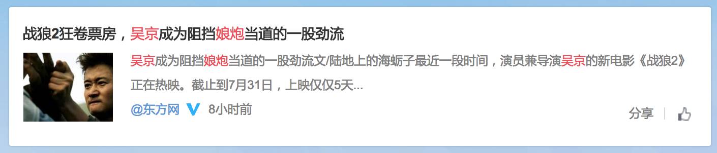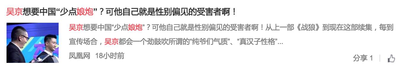 但是除了吴京以外,那些利用吴京的发言就把“硬汉”和“娘炮”对立起来,写出这样题目《战狼2狂卷票房,吴京成为阻挡娘炮当道的一股劲流》的媒体其实才是更需要检讨的人。