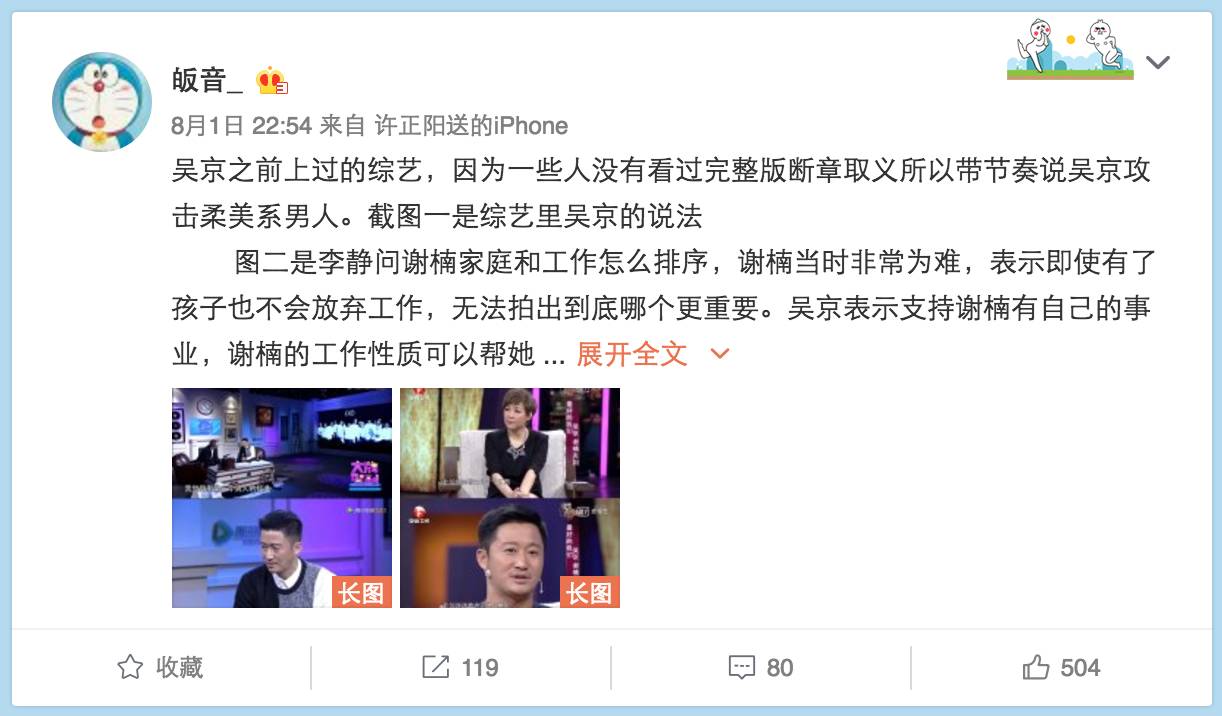 不仅如此,@皈音_ 还提到了吴京在《非常静距离》的一段话。李静问谢楠家庭和工作怎么排序,谢楠当时非常为难,表示即使有了孩子也不会放弃工作,无法排出到底哪个更重要。