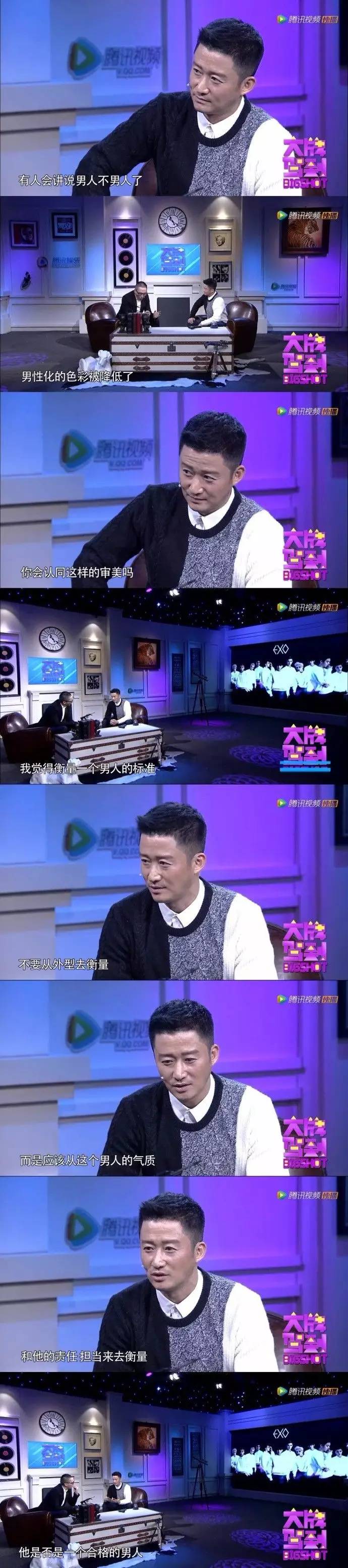 《大牌驾到》这个采访的主基调就是强调吴京的“男人魅力”,在整个采访的开始节目组特意把EXO的照片拿出来问吴京认不认识,并引导定义他们为“漂亮”。