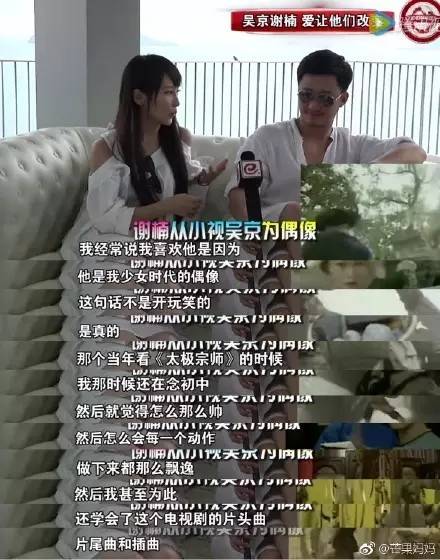 谢楠说吴京是自己少女时代的偶像,而且自己喜欢的就是他是小鲜肉时期的样子,觉得他特别飘逸和帅,吴京也没有觉得自己年轻的时候唇红齿白是黑历史,他只是在后期自我选择去做一个“硬汉”。