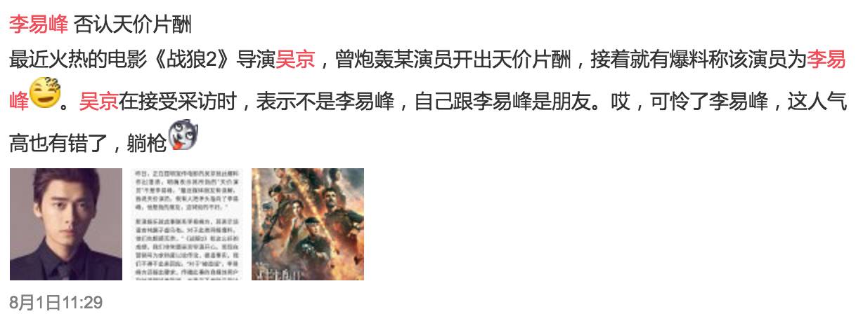 就算是小鲜肉的代表,日常被人diss演技烂的李易峰,媒体瞎写他的新闻说他开天价拒演《战狼2》的时候吴京也第一时间站出来帮他澄清,并且直接说,李易峰是他的朋友。