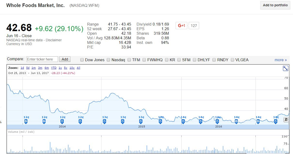 全食超市(NASDAQ:WFM)过去四年股价及被亚马逊收购之后的涨跌幅:
