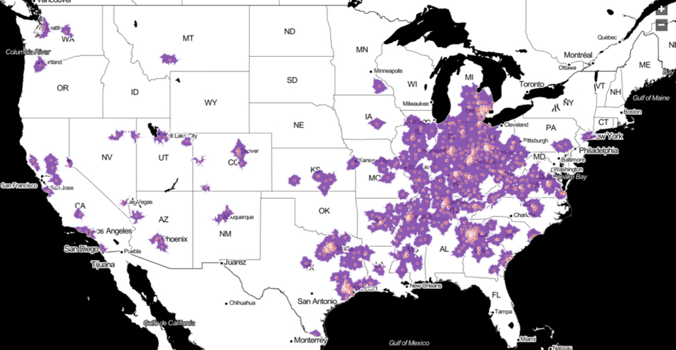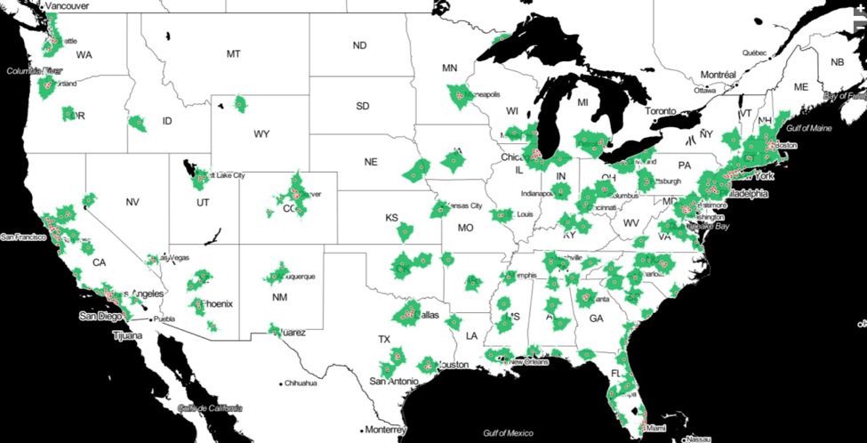 综合选取全食超市在美国所有的门店,对每个门店生成3英里半径和1小时车程的覆盖区域,并对出现大量重合的地方进行合并。