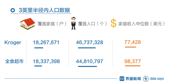从这个数据看,3英里半径内两家超市覆盖的家庭和人口数量非常接近,但全食超市在收入上则要高于Kroger近30%。由于其覆盖的家庭数量多,人口总量却较少,说明其客户群里小家庭、单身、高收入的比例略高。