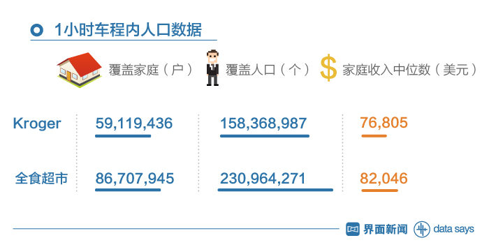 沃尔玛以其4600家门店,在1小时车程内几乎覆盖美国100%的人群。但沃尔玛以其10倍的门店数量、5倍的覆盖面积,在覆盖人群方面只比全食超市多40%。且沃尔玛比全食超市多覆盖的9千万人群,1小时车程内覆盖的家庭收入中位数为4万美元,只占全食超市人群家庭收入(8万2千美元)的一半。