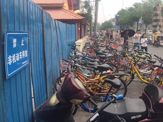 北京五道口地铁站,在禁止非机动车停放的指示牌下,占道停放数十辆单车