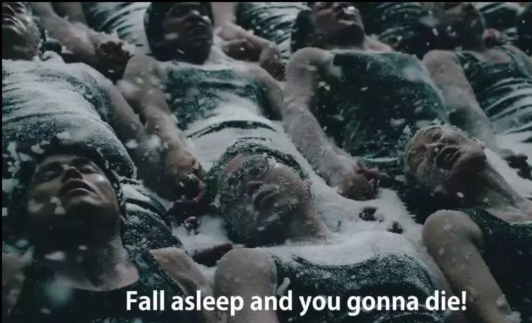 刚刚经历了烈火重生,瞬间又被投入风雪之中。打着冷颤,他们互相鼓励着,提醒着“不要睡着”,睡过去就不会再醒来了。