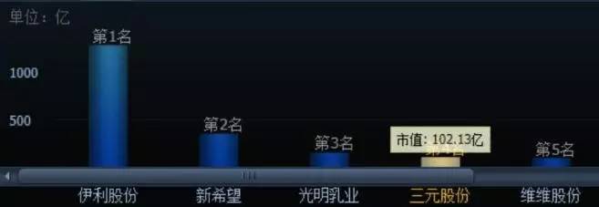 在目前A股乳业类企业中,按市值计,三元以略超过100亿元的市值排在伊利、新希望和光明之后。算上港股市值600亿港元(约516亿人民币)的蒙牛,三元在中国乳企中总市值位列第五。虽然位列前五,但距离第四名的光明乳业都有50%的差距。单靠自身有机发展,三元股份很难在短时间内比肩前几大乳业巨头。