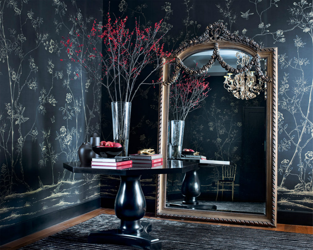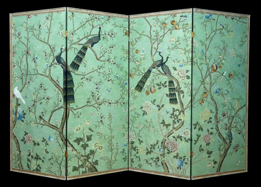 绘画是de Gournay的核心技术,在它的其他系列中,也能找到不少中国风的图样,比如以可可香奈儿为灵感来源的乌木屏风上,就出现了东方孔雀纹样。18世纪中国画风的习得,令这家公司很快打开了东方市场,分公司遍布全球。这些图画除了用于墙纸,也能用在餐盘、布艺、和中国陶瓷器具等各种家具上。据悉,在de Grournay工作的人都经过专业培训,了解陶瓷烧制、上釉、或是别的其他工艺的知识和操作方法,以此来指导图案细节的设计。