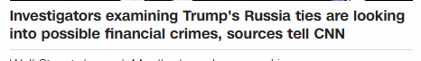 【特朗普“通俄门”调查进入新方向 转而关注财政问题】CNN从熟悉“通俄门”调查的消息人士处获知,目前调查已经转向“特朗普及其团队是否与俄有经济往来”的方向,重点关注可能的金融问题,称调查应更多关注财务关系网络,而不是一味关注2016年大选是否得到了干涉的问题。消息人士同时说,调查已经扩大,联邦调查局正在审议包括特朗普及其家人在内的特朗普集团的财务状况。两位执法人员称,即使是与俄罗斯毫无往来关系但与特朗普有联系的人士也被要求作为特别顾问参与调查合作。