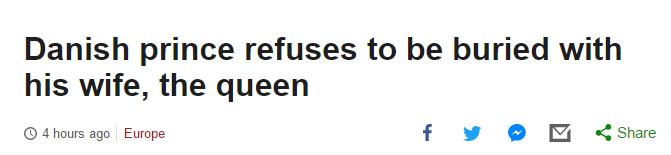 【丹麦亲王拒绝死后与妻子埋在一起】丹麦皇室通讯主任对丹麦报纸BT透漏,83岁的亨利克亲王已经表示自己死后将不会与妻子、现任丹麦女王玛格丽特二世埋在一起:“亨利克亲王多年来一直不满意自己在丹麦君主制下得到的角色和称呼,这并不是秘密。亲王认为在与妻子的关系中处于不平等地位,所以死后不愿与女王葬在一起,这是不难想到的问题。”