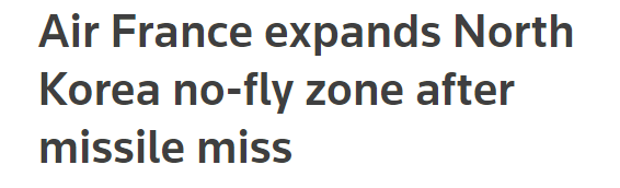【法航扩大朝鲜上空禁飞区范围】法航发言人当地时间周四表示,在得知公司一架飞机曾与朝鲜发射的洲际导弹“擦肩而过”后决定调整航线,扩大靠近朝鲜附近的禁飞区范围。朝鲜上周宣布再次成功发射洲际弹道导弹。法航公告称,根据日本提供的数据,7月28日该公司一架载有323人由东京飞往巴黎的航班一度与坠入大海的朝鲜导弹相距仅100公里。公告称,法国直达东京和大阪的飞机在扩大禁飞区后航程将会延长10到30分钟。