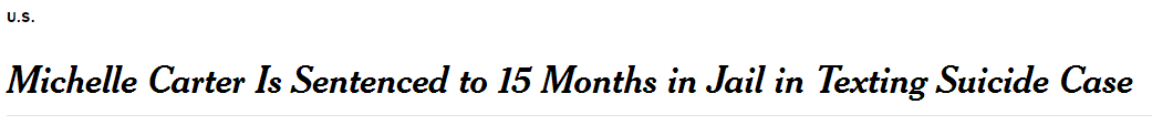 【美国女孩鼓励男友自杀 被判入狱15个月】当地时间周四,因发短信鼓励男友自杀而被起诉的美国女子卡特被判入狱15个月。2014年,18岁的康纳德被发现在车内自杀,死于一氧化碳中毒。警方从手机里发现,康纳德曾发短信给女友卡特说自己害怕,且当时已走出车厢,但卡特知道其试图自杀后不仅没有报警,还发短信鼓励男友回到车内。