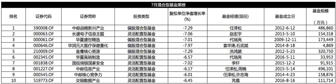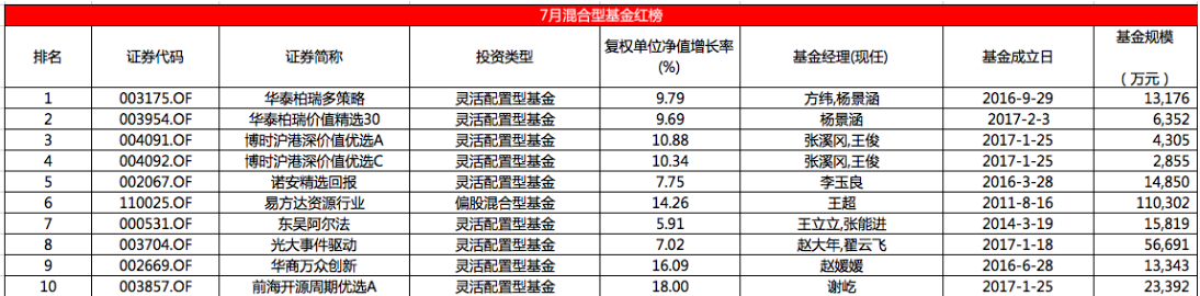 下表为7月综合得分最高的10只混合型基金: