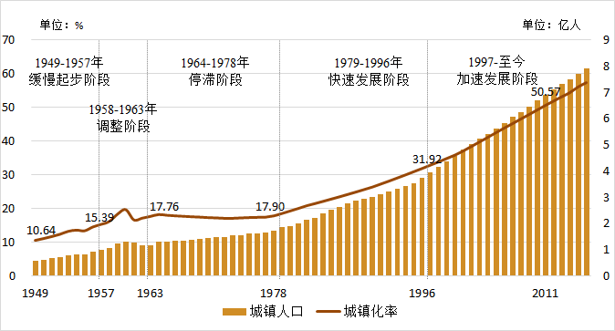 图3:1949-2016年我国城镇率和城镇人口统计