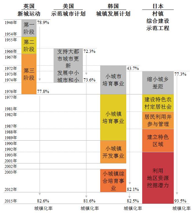 19世纪60年代,工业化和城镇化的高速发展导致大城市人口过度集聚、拥堵不堪,但乡村出现空心化,为分流大城市人口,发达国家启动小城镇建设。其中,英、美、日三国启动小城镇建设时的城镇化率均达到70%,而韩国起步时间较晚,城镇化率在40%-50%之间,与我国较为接近。截至目前,英美韩日等经济发达体均已经完成了对小城镇的开发培育工作,小城镇已成为这些国家经济、人口和产业的主要发展载体: