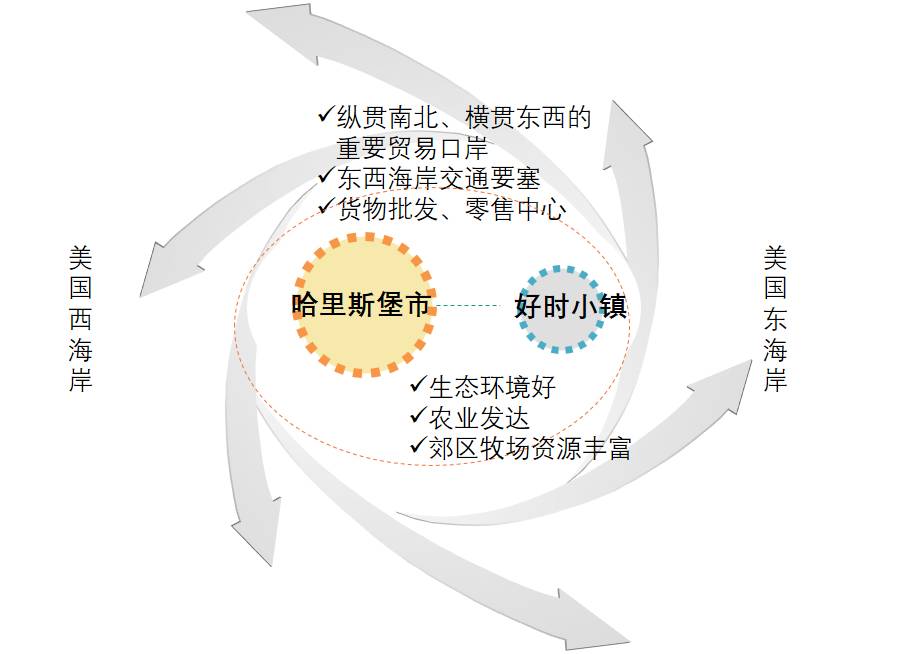 其中,美国好时公司选择横贯东西海岸、纵贯南北的重要交通要塞和贸易口岸哈里斯堡市郊的好时镇建造巧克力制造工厂,逐步发展成北美地区最大巧克力及巧克力糖果制造商。同时,好时持续建造商业和服务机构、学校和医院等基础设施,并通过打造巧克力主题乐园发展旅游业,每年有数十万的游客。