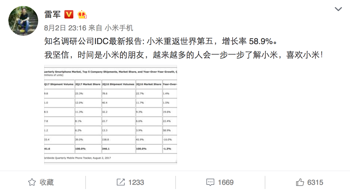 8月2日,雷军连发三条微博公布了来自三家不同调研机构的数据信息。就在一周前,小米刚刚发布了高配低价且找来吴亦凡代言的新手机5X,这款被雷军视为“新零售的战略型产品”或许将在第三季度为小米带来更多的销量增长。