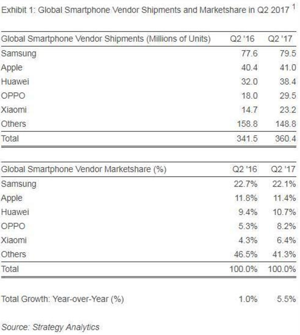 与此同时,市场调研机构Strategy Analytics也在此前发布了2017年第二季度全球智能手机厂商出货量及市场份额报告。在排名上,两家机构的报告结论一致,但在数据上有着小范围的偏差。