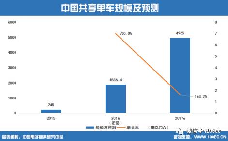 据中国电子商务研究中心(100EC.CN)监测数据显示,共享单车领域异常火热。截止2016年年底,共享单车用户规模达1886.4万人,相比于2015年245万人,呈7倍的爆发式增长。预计2017年用户规模将达到4965万人。