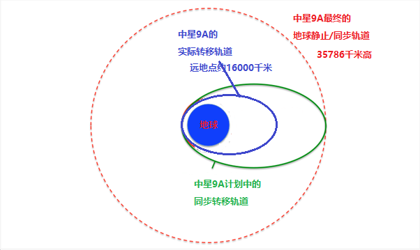 (中星9A原计划的同步转移轨道、实际转移轨道与最终的同步轨道对比图)
