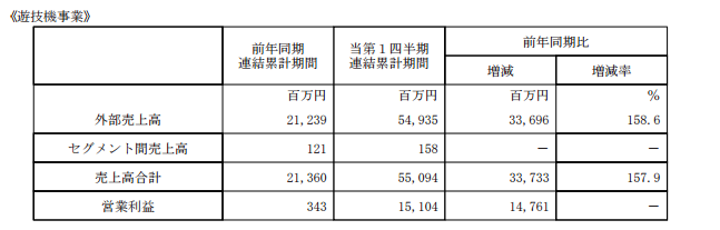 游戏机业务销售总额为549亿日元,比去年同期增长158.6%;营业利润为151亿日元,去年同期仅为3亿日元。