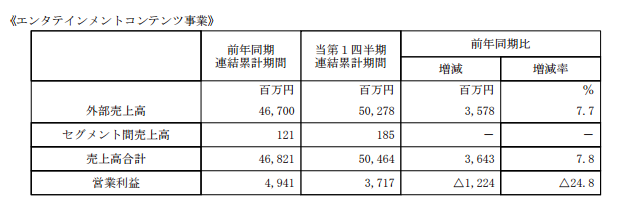 数字娱乐业务销售总额为502亿日元,比去年同期增长了7.7%;营业利润为37亿日元,比去年同期减少了24.8%。
