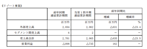 度假村业务销售总额为为20亿日元,比去年同期减少了23.4%;营业利润亏损了7.3亿日元。