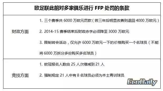 例如,作为一家英超俱乐部,在为期3年的时间里转会赤字上限(Acceptable Limit)是1.05亿英镑,或是在一年时间里为4500万欧元。如果有俱乐部超过这个上限,那么欧足联就有权对俱乐部进行多个方面的处罚,包括高额罚款、限制购买球员金额上限、减少其俱乐部在欧冠或欧联的报名人数等。