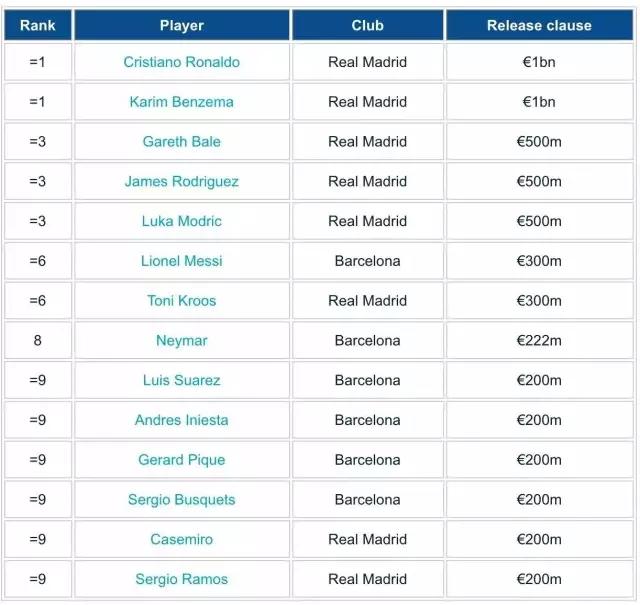 世界球星合同违约金排名,C罗与本泽马以10亿欧元并列榜首
