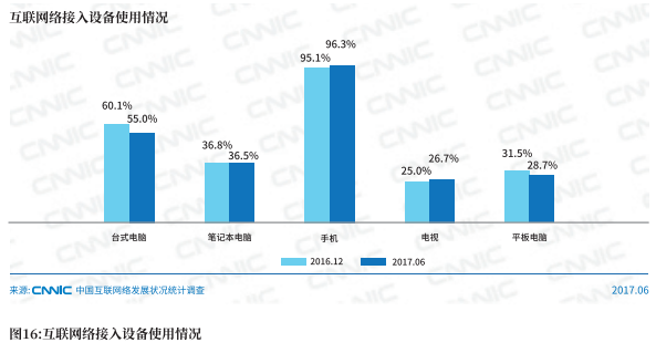 2017 年上半年,网民使用手机和电视上网的比例较 2016 年底均有所提升。截至 2017 年 6 月,我国网民使用手机上网的比例达到 96.3%,较 2016 年底增长了 1.2 个百分点; 智能家居行业快速发展,智能电视作为家庭娱乐设备的上网功能进一步显现,使用电视上 网的比例为 26.7%,较 2016 年底增长了 1.7 个百分点;与此同时,使用台式电脑、笔记本电脑、平板电脑上网的比例分别为 55.0%、36.5%、28.7%,较 2016 年底分别下降了 5.1、 0.3 和 2.8 个百分点。
