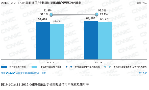 截至 2017 年 6 月,即时通信用户规模达到 6.92 亿,较 2016 年底增长 2535 万,占 网民总体的 92.1%。其中手机即时通信用户 6.68 亿,较 2016 年底增长 2981 万,占手机 网民的 92.3%。