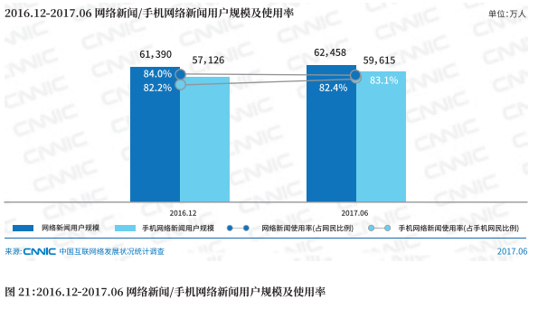 截至 2017 年 6 月,我国网络新闻用户规模为 6.25 亿,半年增长率为 1.7%,网民使 用比例为 83.1%。其中,手机网络新闻用户规模达到 5.96 亿,占手机网民的 82.4%,半年增长率为 4.4%。