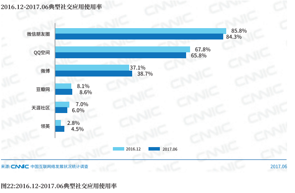 截至2017年6月,使用率排名前三的社交应用均属于综合类社交应用。微信朋友圈、QQ空间用户使用率分别为84.3%和65.8%;微博用户使用率持续回升,达38.7%,较2016年12月上升1.6个百分点。垂直类社交应用中,豆瓣用户使用率为8.6%。