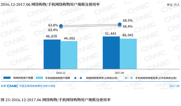 截至2017年6月,我国网络购物用户规模达到5.14亿,相较2016年底增长10.2%,其中,手机网络购物用户规模达到4.80亿,半年增长率为9.0%,使用比例由63.4%增至66.4%。