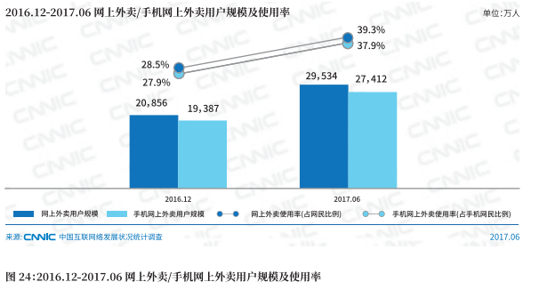 截至2017年6月,我国网上外卖用户规模达到2.95亿,较2016年底增加8678万,增长率达到41.6%。其中,我国手机网上外卖用户规模达到2.74亿,增长率为41.4%,使用比例达到37.9%,提升10个百分点。