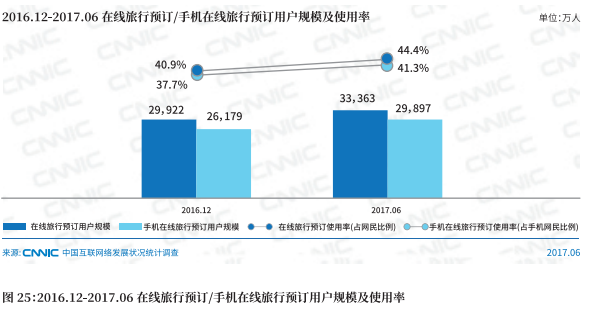 截至2017年6月,在网上预订过机票、酒店、火车票或旅游度假产品的网民规模达到3.34亿,较2016年底增长3441万人,增长率为11.5%。在网上预订火车票、机票、酒店和旅游度假产品的网民分别占比37.6%,19.1%,20.5%和9.3%。其中,手机预订机票、酒店、火车票或旅游度假产品的网民规模达到2.99亿,较2016年底增长3717万人,增长率为14.2%。