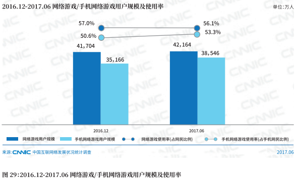 截至2017年6月,我国网络游戏用户规模达到4.22亿,较去年底增长460万,占整体网民的56.1%。手机网络游戏用户规模为3.85亿,较去年底增长3380万,占手机网民的53.3%。