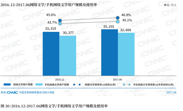 截至2017年6月,网络文学用户规模达到3.53亿,较去年底增加1936万,占网民总体的46.9%,其中手机网络文学用户规模为3.27亿,较去年底增加2291万,占手机网民的45.1%。