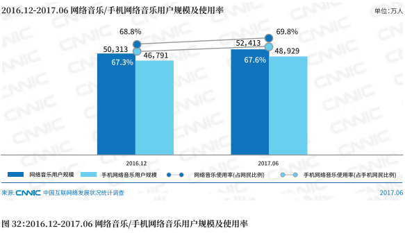 截至2017年6月,网络音乐用户规模达到5.24亿,较去年底增加2101万,占网民总体的69.8%。其中手机网络音乐用户规模达到4.89亿,较去年底增加2138万,占手机网民的67.6%。