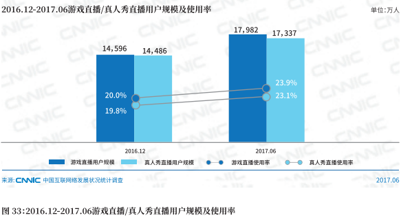 从网络直播的内容类别来看,游戏直播和真人秀直播用户使用率明显增长。其中,游戏直播用户规模达到1.80亿,较去年底增加3386万,占网民总体的23.9%;真人秀直播用户规模达到1.73亿,较去年底增加2851万,占网民总体的23.1%。