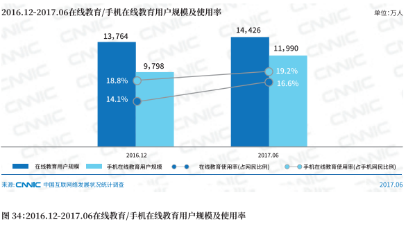 截至2017年6月,中国在线教育用户规模达1.44亿,较2016年底增加662万人,半年增长率为4.8%;在线教育用户使用率为19.2%,较2016年底增加0.4个百分点。其中,手机在线教育用户规模为1.20亿,与2016年底相比增长2192万人,增长率为22.4%;手机在线教育用户使用率为16.6%,相比2016年底增长2.5个百分点。
