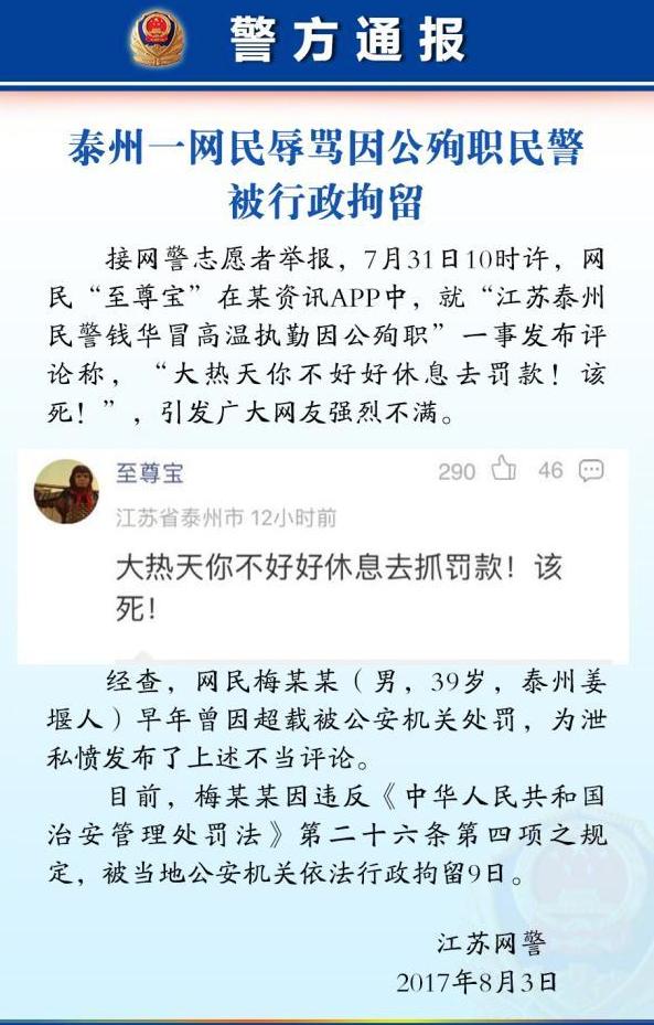 8月3日下午,江苏省公安厅官方微博@平安江苏发布警方通报称,江苏泰州一网民辱骂因公殉职民警,被当地公安机关行政拘留9天。据江苏警方称,7月31日10时许,网民“至尊宝”在某资讯APP中,就“江苏泰州民警钱华冒高温执勤因公殉职”一事发布评论称,“大热天你不好好休息去罚款!该死!”,引发广大网友强烈不满。